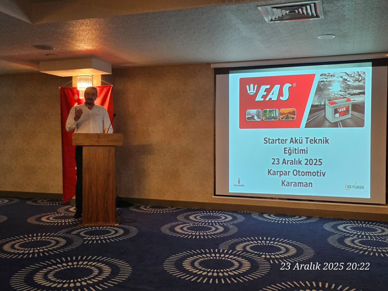 New Karaman Otel’de düzenlenen programa Karpar Otomotiv Şirket Sahibi Beytullah Karakaş, EAS Akü Bölge Sorumlusu Emrah Karlıdağ ile çok sayıda oto elektrik ustası katıldı.