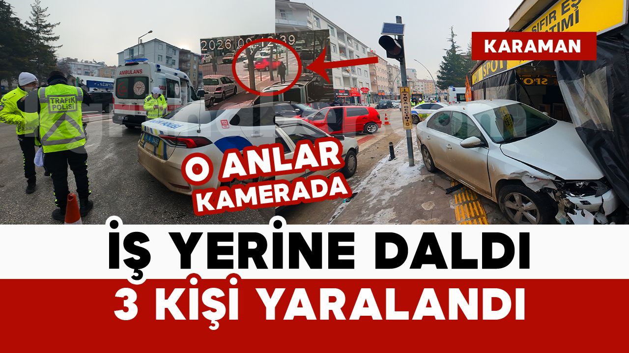 Kaza anı ise güvenlik kameralarına yansıdı. Görüntülerde araçların kavşakta çarpıştıktan sonra araçlardan birinin savrularak iş yerine daldığı anlar görülüyor. Kazada araç sürücüleri ile 70 F* 1*7 plakalı araçtaki 1 kişi yaralandı. İhbar üzerine yerine sağlık ve polis ekipleri sevk edildi. Kazada yaralananlar ambulanslarla Karaman Eğitim ve Araştırma Hastanesi’ne kaldırılarak tedavi altına alındı. Kaza sebebiyle iş yerinde ise maddi hasar meydana geldi. Polisin kaza yerindeki incelemesinin ardından araçlar çekiciyle kaldırıldı. Kazayla ilgili tahkikat başlatıldı.
