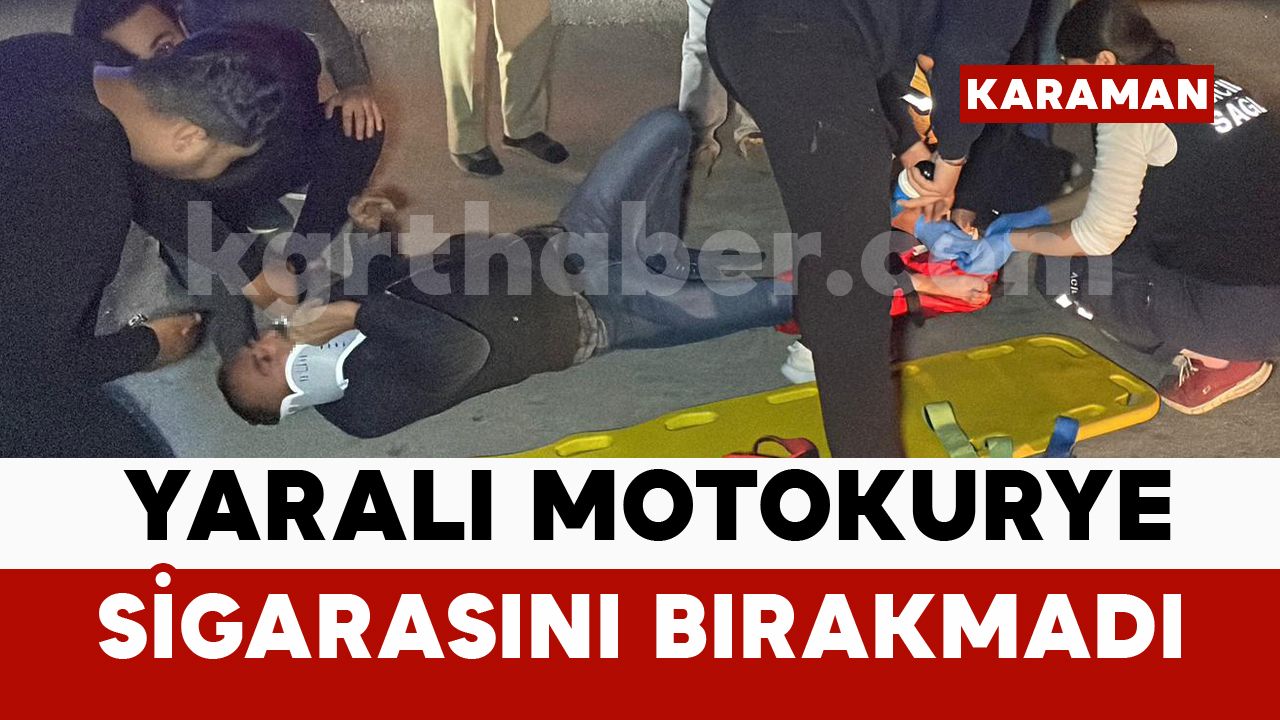 Kaza, akşam saatlerinde Hürriyet Mahallesi Kuva-yı Milliye Caddesi üzerindeki kavşakta meydana geldi. Edinilen bilgiye göre, S.E. idaresindeki 70 A*S 6*9 plakalı motosiklet sürücüsünün direksiyon hakimiyetini kaybetmesi sonucu kontrolden çıkarak devrildi. İhbar üzerine kaza yerine sağlık ve polis ekipleri sevk edildi. Kazada yaralanan motokuryenin yanına gelen arkadaşı yaralı arkadaşına sigara uzattı. Sigarayı alan yaralı sağlık ekibi müdahale ettiği esnada sigarayı içmeye devam etti. Daha sonra ambulansla alınacağı için sağlık ekibinin uyarısıyla sigarayı arkadaşına veren motokurye ambulansla Karaman Eğitim ve Araştırma Hastanesi’ne kaldırılarak tedavi altına alındı. Kazayla ilgili tahkikat başlatıldı.