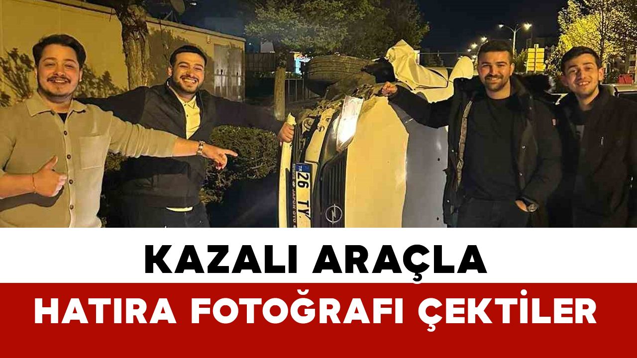 Arkadaş grubu içinde kimsenin bulunmadığı yan yatmış araçla hatıra fotoğrafı çekindi.