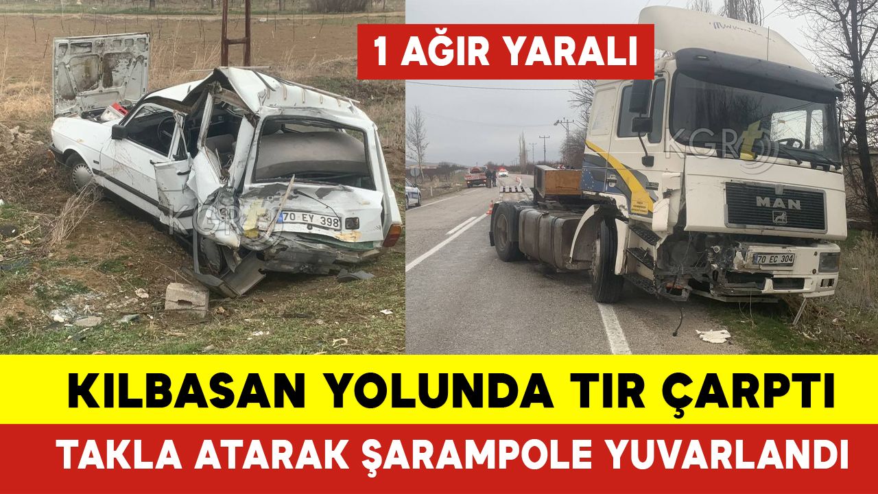 Kaza ikindi saatlerinde Kılbasan Yolu üzerinde meydana geldi. Edinilen bilgiye göre B.Ö. yönetimindeki tır seyir halinde olan E.K. yönetimindeki 70 EY 398 plakalı otomobile arkadan çarptı. çarpışmanın etkisiyle Takla atarak şarampole yuvarlanan otomobilde sıkışan sürücü olay yerine gelen itfaiye ekiplerinin müdahalesiyle sıkıştığı yerden çıkarılarak ambulansla Karaman Eğitim ve Araştırma Hastanesi’ne kaldırıldı. Çekicinin sürücüsü kazayı yara almadan atlatırken yol kısa süreliğine trafiğe kapatıldı. Polis kazayla ilgili inceleme başlattı.