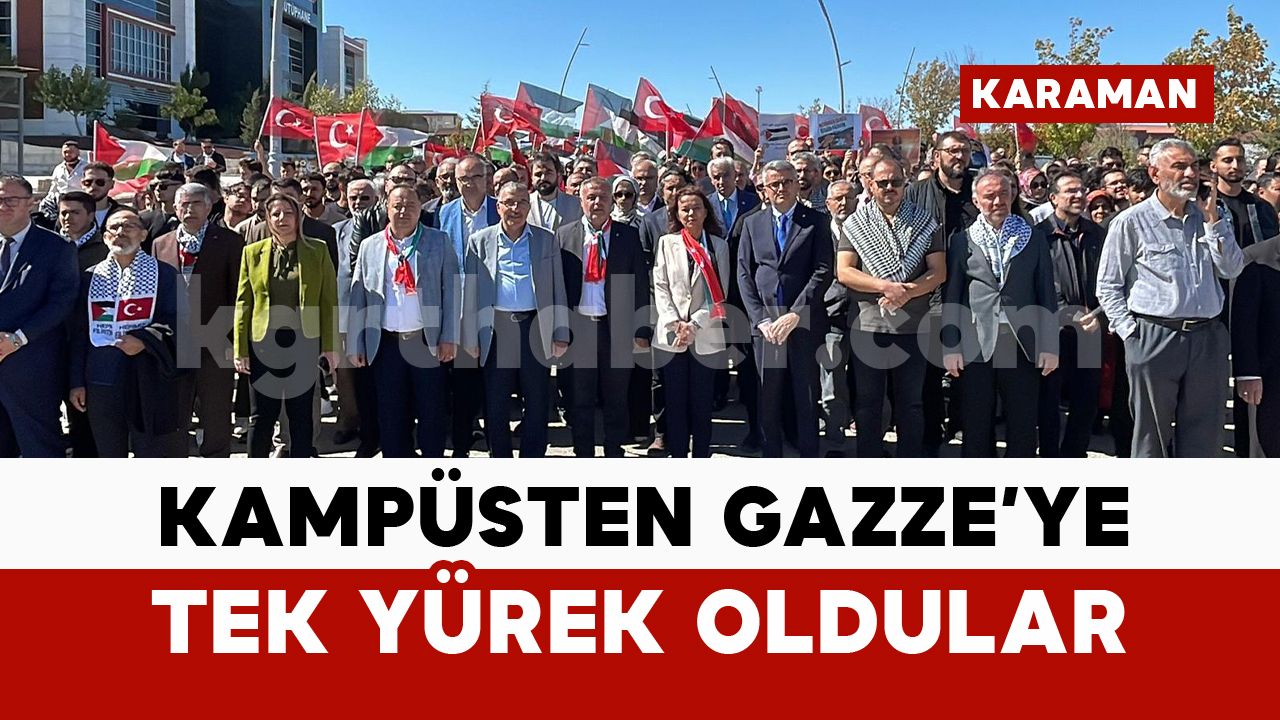 Karamanoğlu Mehmetbey Üniversitesi’nde (KMÜ) İlim ve Medeniyet Öğrenci Topluluğu tarafından düzenlenen “Kampüsten Gazze’ye Tek Yürek” yürüyüşünde öğrenciler, akademisyenler ve Gazze’deki mazlumların sesi olmak, adalete ve insanlık onuruna sahip çıkmak için bir araya geldi. KMÜ kampüsü içerisinde bulunan kütüphane üzerinde toplanan kalabalık Türk ve Filistin bayraklarıyla Sağlık, Kültür ve Spor Daire Başkanlığı Binası önüne kadar yürüdü.