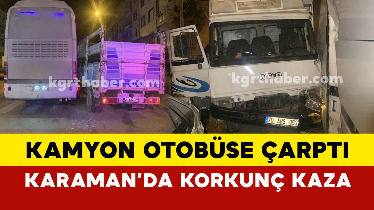 Kaza, akşam saatlerinde Nefise Sultan Mahallesi Doktor Sadık Ahmet Caddesi üzerindeki kavşakta meydana geldi. Edinilen bilgiye göre, İ.A. idaresindeki 70 ABS 053 plakalı kamyon kontrolden çıkarak T.A. idaresindeki 58 EU 304 plakalı otobüse çarptı. Çarpışmanın etkisiyle savrulan kamyon park halindeki 2 otomobile çarparak durabildi. Kazada kamyon sürücüsü T.A. ve park halindeki 26 KV 094 plakalı otomobildeki 11 yaşındaki M.A. yaralandı. İhbar üzerine olay yerine sağlık, itfaiye ve polis ekibi sevk edildi. Kazada yaralananlar ambulansla Karaman Eğitim ve Araştırma Hastanesi’ne kaldırılarak tedavi altına alındı. Kazaya karışan otobüs sürücüsü T.A., “Kamyon ana yoldan geldi ve durmadan otobüse çarptı, sonra da park halindeki 2 araca çarptı” diyerek kaza anını anlattı. Kazaya karışan kamyon çekici ile yolan kaldırılırken kazayla ilgili tahkikat başlatıldı.