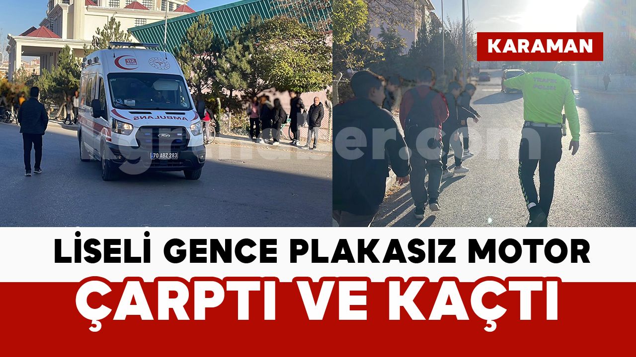 Kaza, 16.00 sıralarında Elmaşehir Mahallesi 2242. Sokak üzerinde meydana geldi. Edinilen bilgiye göre, sürücüsünün ismi öğrenilemeyen plakasız motosiklet liseli gence çarptı. Liseli genç yere düşerek yaralanırken motosiklet kaza yerinden kaçtı. İhbar üzerine adrese sağlık ve polis ekipleri sevk edildi. Kazada yaralanan genç ambulansla Karaman Eğitim ve Araştırma Hastanesi’ne kaldırılırken, polis kaza yerinde inceleme yaptı. Kazayla ilgili tahkikat başlatıldı.