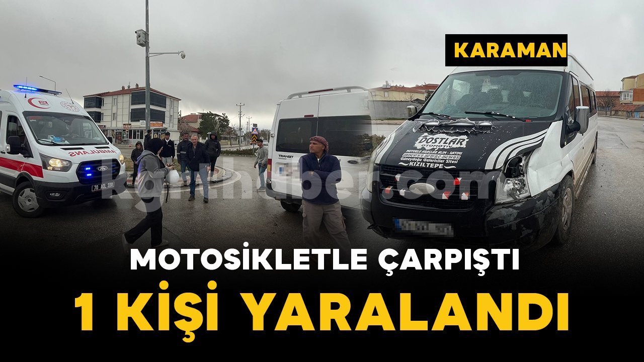 Kaza, Larende Mahallesi Ahmet Öktem Caddesi üzerinde bulunan kavşakta meydana geldi. Edinilen bilgiye göre, M.A. idaresindeki 63 AT 9*3 plakalı minibüs ile M.Z. yönetimindeki 70 A* 0*8 plakalı motosiklet kavşakta çarpıştı. Çarpışmanın etkisiyle devrilen motosikletin sürücüsü yaralandı. İhbar üzerine olay yerine sağlık ve polis ekipleri sevk edildi. Yaralı sürücü, olay yerinde yapılan ilk müdahalesinin ardından ambulansla Karaman Eğitim ve Araştırma Hastanesi'ne kaldırılarak tedavi altına alındı.