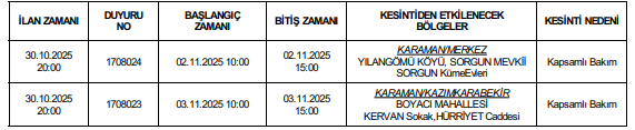 MERAM Elektrik Dağıtım A.Ş. Karaman 1 İşletme sorumluluk alanında bulunan Karaman'da planlı elektrik kesintisi yapacak.