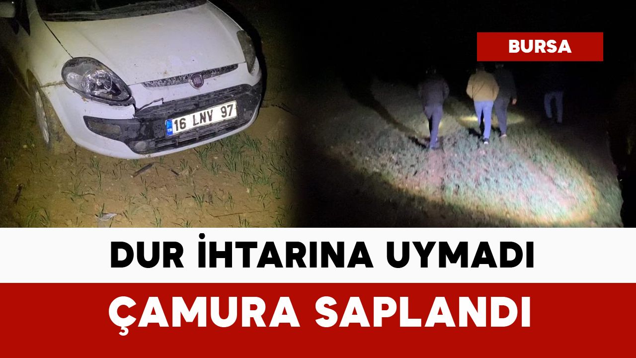 Ekiplerin dur ihtarına uymayan sürücü otomobil ile hızla kaçmaya başladı. Tüm polis ekipleri şüphelinin peşine düştü. 30 kilometre boyunca süren kovalama sırasında İnegöl'e bağlı kırsal Yeniyörük mahallesinde tarlalık alana giren sürücünün aracı çamura saplandı. Sürücü aracı kilitleyip yaya olarak ormanlık alana kaçtı. Karanlıktan faydalanan şahıs izini kaybettirdi. Polis ekipleri sürücünün yakalanması için çalışma başlatırken, otomobil çekici vasıtasıyla otoparka çekildi.