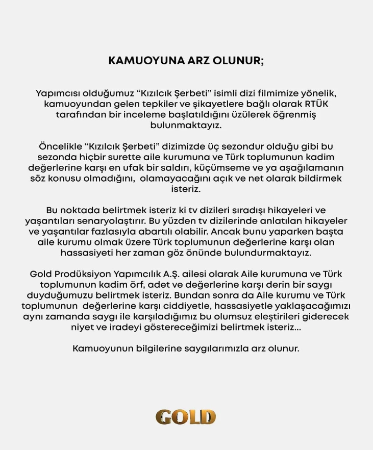 "Yapımcısı olduğumuz 'Kızılcık Şerbeti' isimli dizi filmimize yönelik, kamuoyundan gelen tepkiler ve şikayetlere bağlı olarak RTÜK tarafından bir inceleme başlatıldığını üzülerek öğrenmiş bulunmaktayız." "Öncelikle 'Kızılcık Şerbeti' dizimizde üç sezondur olduğu gibi bu sezon da hiçbir surette aile kurumuna ve Türk toplumunun kadim değerlerine karşı en ufak bir saldırı, küçümseme veya aşağılamanın söz konusu olmadığını, olamayacağını açık ve net olarak bildirmek isteriz."