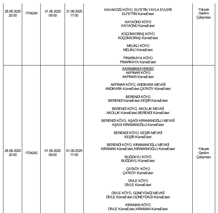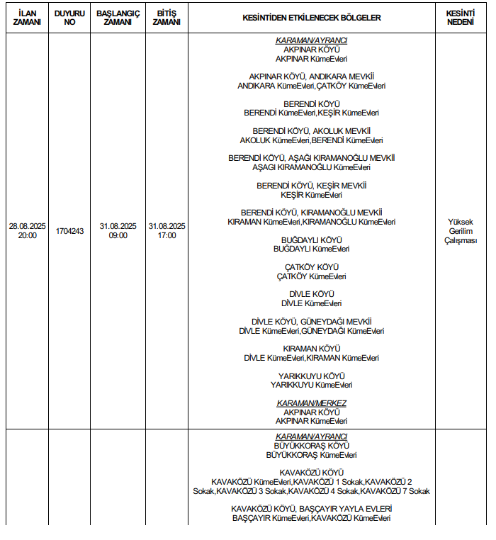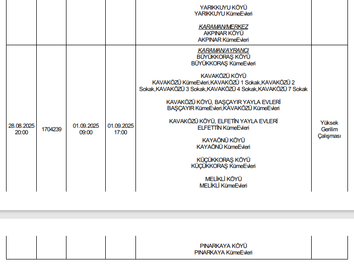 MERAM Elektrik Dağıtım A.Ş. Karaman 1 İşletme sorumluluk alanında bulunan Karaman'da planlı elektrik kesintisi yapacak.