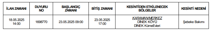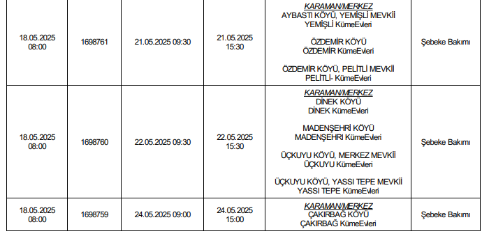 MERAM Elektrik Dağıtım A.Ş. Karaman 1 İşletme sorumluluk alanında bulunan Karaman'da planlı elektrik kesintisi yapacak.