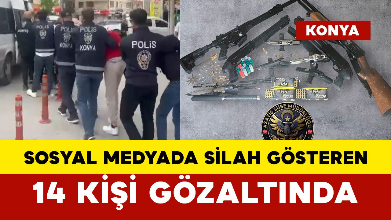 Konya’da sosyal medya üzerinden ateşli silahları sergileyerek kamu düzenini tehdit eden paylaşımlarda bulunan kişilere yönelik düzenlenen operasyonda 14 şüpheli gözaltına alındı.