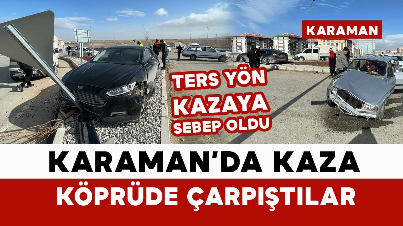 Kaza, sabah saatlerinde Üniversite Mahallesi Karaman Çevre Yolu üzerindeki köprüde meydana geldi. Edinilen bilgiye göre, Ümmü G. idaresindeki 70 A* 7*6 plakalı otomobil ile Esra K. yönetimindeki 70 A*K 7*6 plakalı Ford marka otomobil çarpıştı. Çarpışmanın etkisiyle araçlardan biri refüje çıkarak yön levhasına çarptı. Kazada şans eseri yaralanan olmazken, ihbar üzerine olay yerine sağlık ve polis ekipleri sevk edildi. Tedbir amaçlı olay yerine gelen sağlık ekipleri, sürücülerin durumunun iyi olduğunu belirledi. Polis ekipleri ise yolda güvenlik önlemi alarak inceleme yaptı. Öte yandan ters yöne girerek kazaya sebebiyet veren 70 A* 7*6 plakalı otomobil sürücüsü Ümmü G.’ye para cezası kesildi. Kazayla ilgili tahkikat başlatıldı.