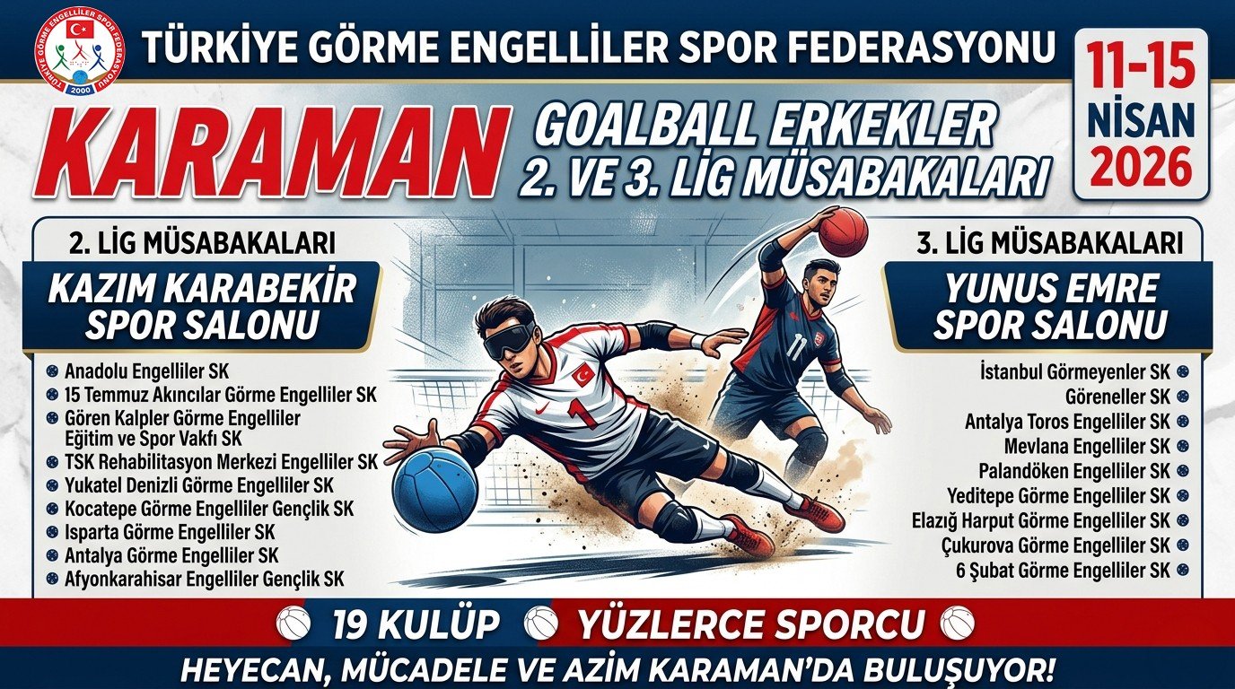 Türkiye Görme Engelliler Spor Federasyonu’nun 2026 yılı faaliyet programında yer alan Golbol Erkekler 2. Lig ve 3. Lig 1. Devre müsabakaları, 11-15 Nisan 2026 tarihleri arasında Karaman’da gerçekleştirilecek.