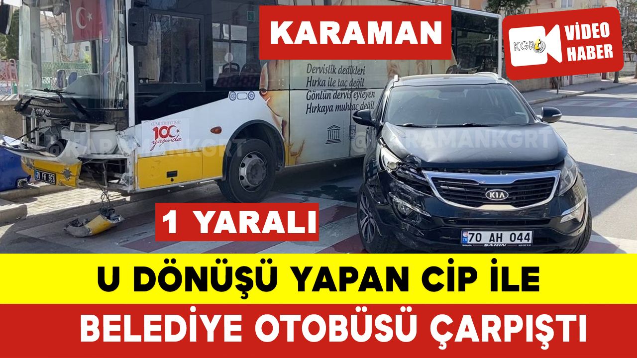 Karaman’da İmaret Mahallesi’nde sabah saatlerinde meydana gelen kazada iddiaya göre, sürücüsünün ismi öğrenilemeyen 70 AH 044 plakalı cip u dönüşü yaptığı esnada 70 FH 963 plakalı belediye otobüsü ile çarpıştı. İhbar üzerine olay yerine sağlık ve polis ekipleri sevk edildi. Kazada otobüste yolcu konumunda bulunan S.Ş. isimli kadın yaralandı. Kazada yaralanan kadın ambulansla Karaman Eğitim ve Araştırma Hastanesi’ne kaldırıldı. Polis kazayla ilgili inceleme başlattı.