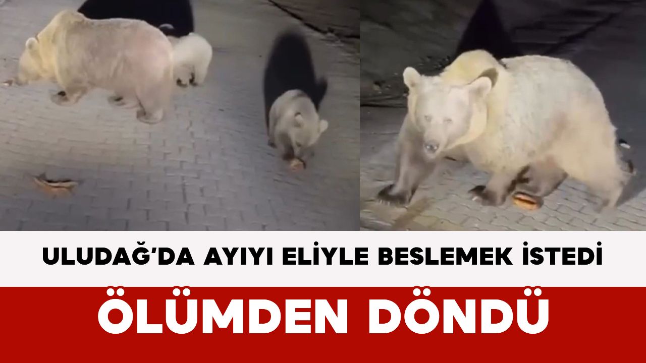 Edinilen bilgilere göre Uludağ’da doğa gezisine çıkan sürücü, yol kenarında yiyecek arayan bir ayıyla karşılaştı. Tehlikeyi göz ardı eden sürücü, aracın camını indirerek ayıyı elinden beslemek istedi. Ancak ayı bir anda öne doğru saldırı pozisyonuyla hamle yapınca, sürücü büyük panik yaşadı.