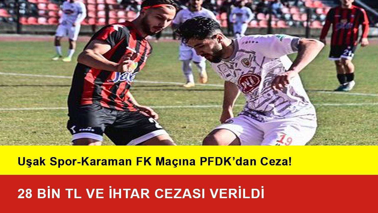 Ligin 26. Haftasında Uşak’ta oynanan Uşak Spor ile Karaman FK karşılaşmasına PFDK tarafından ceza verildi. Karaman FK’nın 2-0 üstünlükle kazandığı maçta, Uşak Spor müsabakada güvenlik görevlisi bulundurmaması nedeniyle 28 Bin TL para cezası ve forma arkasında futbolcuların isimlerinin yazmamasından dolayı ihtar cezası ile cezalandırılması kararı verildi. PFDK tarafından verilen cezada, “Uşak Spor A.Ş.’nin, 18.02.2024 tarihinde oynanan Uşak Spor A.Ş.-Karaman Futbol Kulübü TFF 2. Lig Kırmızı Grup müsabakasında, müsabakada özel güvenlik görevlisi bulundurmamasından dolayı talimatlara aykırılık nedeniyle 28.000.-TL Para Cezası ile cezalandırılmasına,