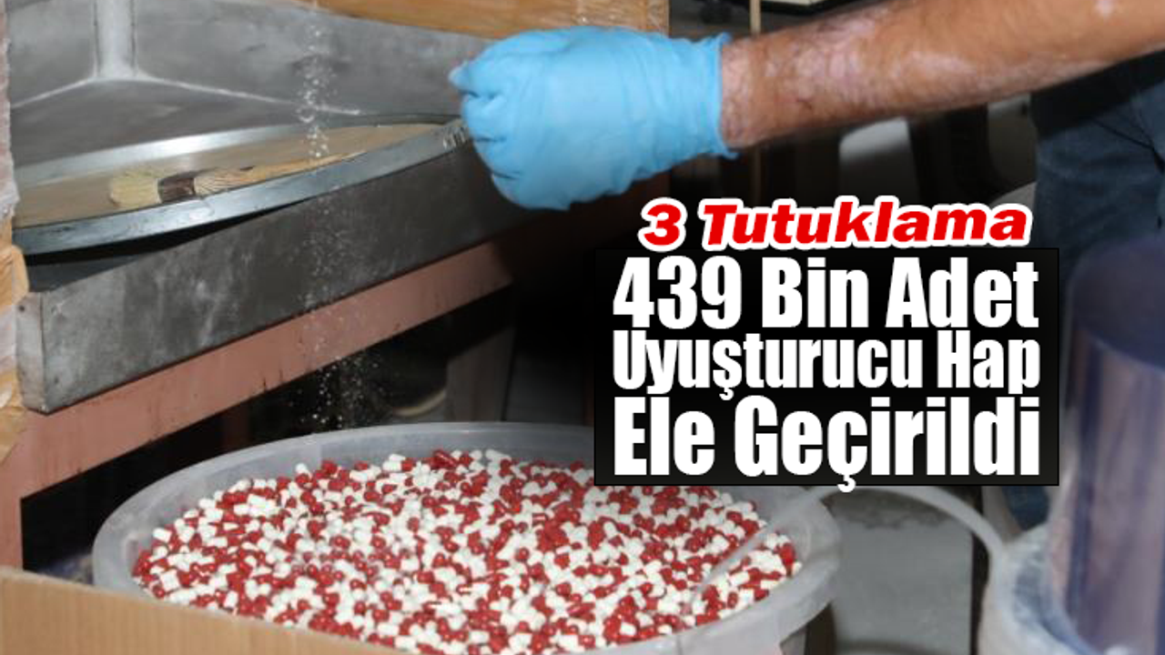 Edinilen bilgiye göre, Mersin Narkotik Suçlarla Mücadele Şube Müdürlüğü ekipleri, Anamur ilçesinde bir adreste uyuşturucu imal edildiği bilgisi üzerine adrese operasyon düzenledi. Operasyonda 4 şüpheli gözaltına alınırken, yapılan aramada 439 bin adet uyuşturucu hap ile bu hapların imalatında kullanılan 3 makine ele geçirildi. Emniyetteki işlemlerinin ardından adliyeye sevk edilen şüphelilerden V.Y., D.U. ve M.T. tutuklanırken, 1 kişi de adli kontrol şartıyla serbest bırakıldı. İHA