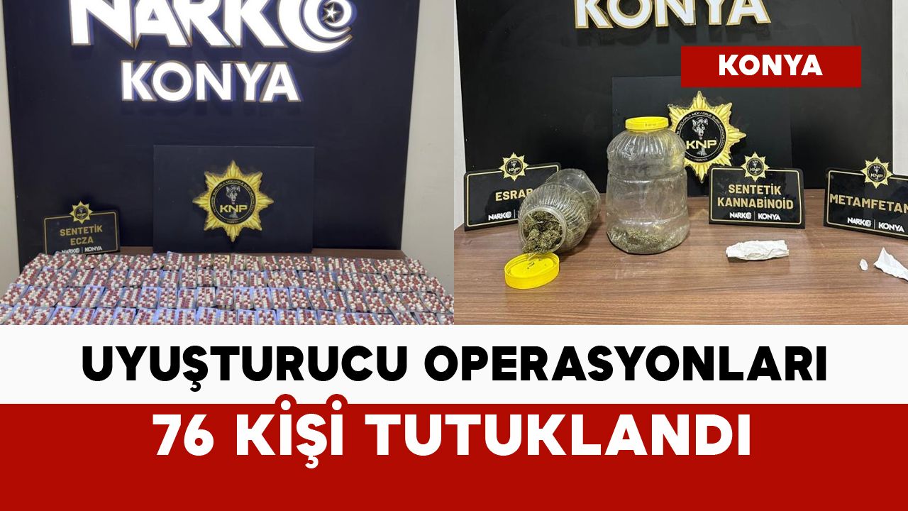 Edinilen bilgiye göre, Konya Narkotik Suçlarla Mücadele Şube Müdürlüğü ekipleri tarafından uyuşturucu ticareti ve kullanımına yönelik il genelinde operasyonlar gerçekleştirildi. Çalışmalar kapsamında, 33 bin 581 adet sentetik ecza, 1 kilo 624,33 gram kokain, 1 kilo 349,19 gram sentetik kannabinoid, 414,01 gram bonzai hammaddesi (toplam 62 kg sentetik kannabinoid üretilebilir), 288,85 gram esrar, 229 adet captagon, 119,28 gram metamfetamin, 79 adet extacy, 34 bin 446 kullanımlık peçeteye emdirilmiş sentetik kannabinoid, 32,31 gram eroin, ayrıca 3 hassas terazi, 3 ruhsatsız tabanca ve 11 fişek ele geçirildi.